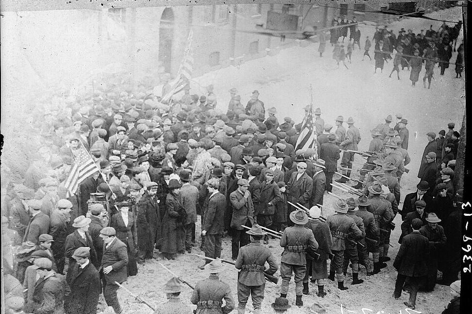 Bain News Service, Publisher. Guarding Approach to Mills, Lawrence, Mass., 1/12/1912. https://www.loc.gov/item/2014690135/.